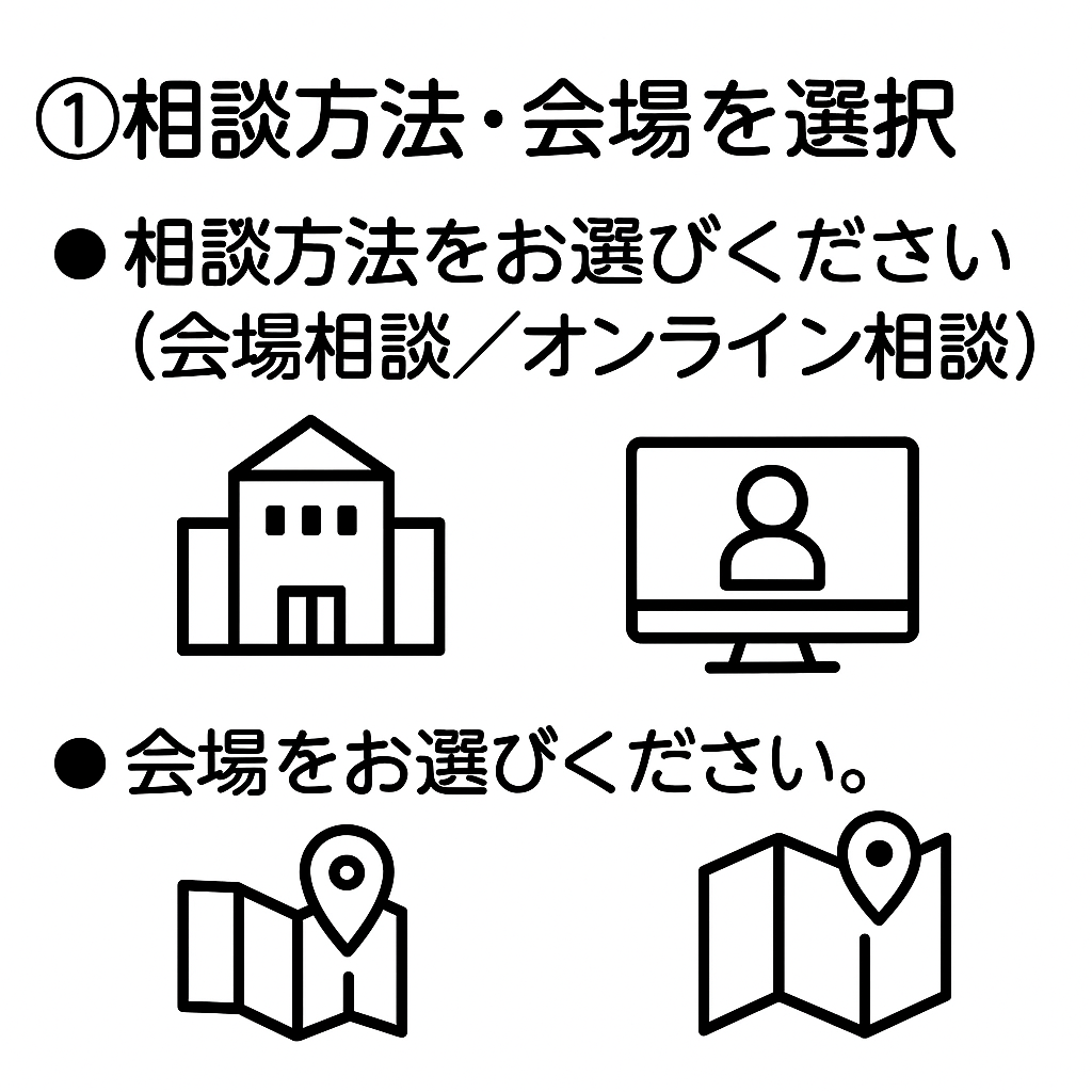 ※各相談会場には、待合スペースがありませんので、相談開始時刻前に会場にお越しになられても、会場にご入場することはできませんので、あらかじめご了承ください。